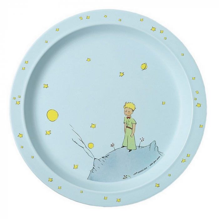 Assiette bebé Petit Jour, Le Petit Prince sur sa planète. Proportion idéale pour des petits enfants. Elle dispose d'un rebord ergonomique pour aider l’enfant à prendre les aliments et manger presque tout seul. Lavable en lave-vaisselle. Ne pas utiliser au micro-ondes, ni au congélateur. Matière: mélanine. Diamètre: Ø21cm.