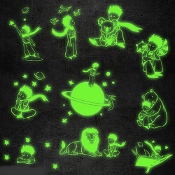 4 Planches de stickers autocollants fluorescents. Décorez vos objets de tous les jours avec ces autocollants du Petit Prince qui brillent dans le noir.