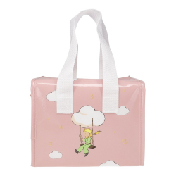 Sac isotherme repas Kiub Le Petit Prince sur une balançoire. L'intérieur est en aluminium tandis que l'extérieur est en plastique recyclé. Ainsi, il gardera les aliments au froid ou au chaud. Il dispose d'une fermeture éclair et d'une poignée en tissu pour un transport facile. Dimensions: 21,5x12x16,5cm.