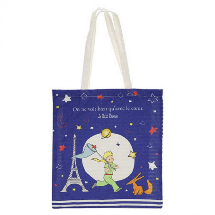 Sac en coton Kiub Le Petit Prince: Le Petit Prince avec le Renard et la Tour Eiffel attrapent les étoiles. Dimensions: 37x10x40cm.