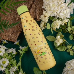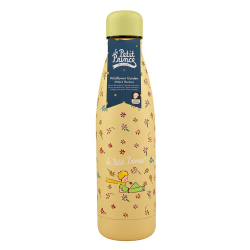 Bouteille isotherme de haute qualité: Le Petit Prince dans un jardin fleuri. Bouchon à vis solide et étanche. Sa double paroi en acier inoxydable conserve vos boissons chaudes jusqu’à 12h et fraîches jusqu’à 24h. 500ml.