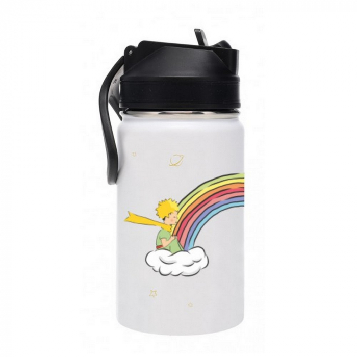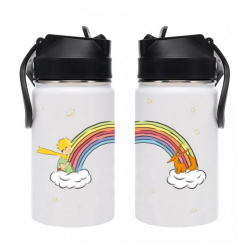 Bouteille isotherme avec paille en acier inoxydable de haute qualité Le Petit Prince et l'arc-en-ciel de la marque Kiub. L'effet isolant du matériau garde le liquide au chaud ou froid pendant environ 12 heures. Plongez dans l'univers du petit prince et laissez-vous envoûter ! 350ml.