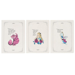 Set de 3 carnets de notes Erik Disney Alice au pays des merveilles. Les 3 carnets possèdent 32 feuilles de 80g, soit 64 pages. Un carnet est pointillé, l'autre ligné et l'autre avec des pages blanches. Couverture souple, avec trois designs différents. Dimensions: 14,8x21cm.