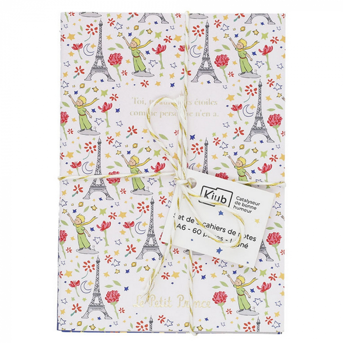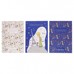 Set de 3 carnets de notes Kiub Le Petit Prince et la Tour Eiffel. Cahiers lignés, 60 pages. Dimensions 10,5x14,7cm.