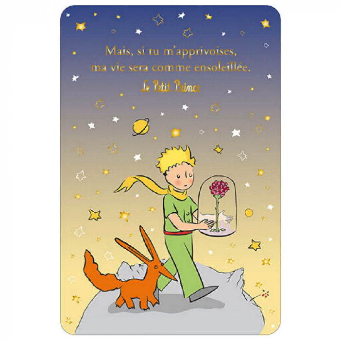 Carte postale de la marque Kiub, Le Petit Prince, le Renard et la Rose sur sa planète. 10x15cm.