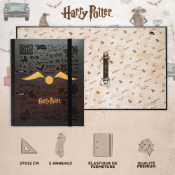 Classeur 2 anneaux Erik Harry Potter. Couverture rigide doublée de papier plastifié mat. Intérieur personnalisé selon le design. 28x32cm.