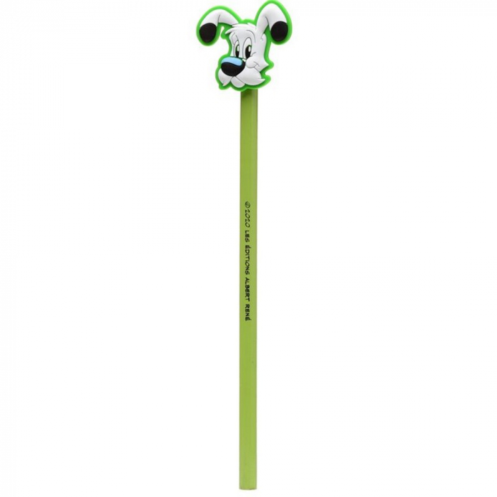 Crayon en bois avec figurine en PVC de collection Astérix et Obélix: le portrait d'Idéfix. Hauteur: 19cm.
