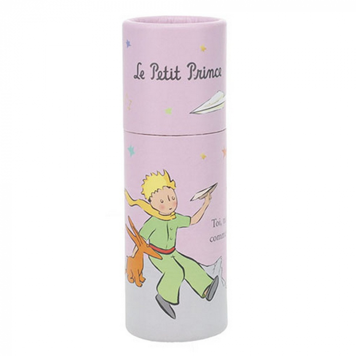 Boîte Tube avec 12 crayons de couleur Le Petit Prince avec un avion en papier de la marque Kiub. Hauteur: 8cm.
