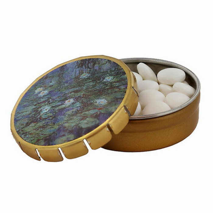 Boîte de bonbons Claude Monet: Les Nymphéas. Bonbons sans sucres avec édulcorants, aromatisés saveur menthe forte. Ne convient aux enfants de moins de 3 ans. Fabriqué en France.