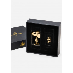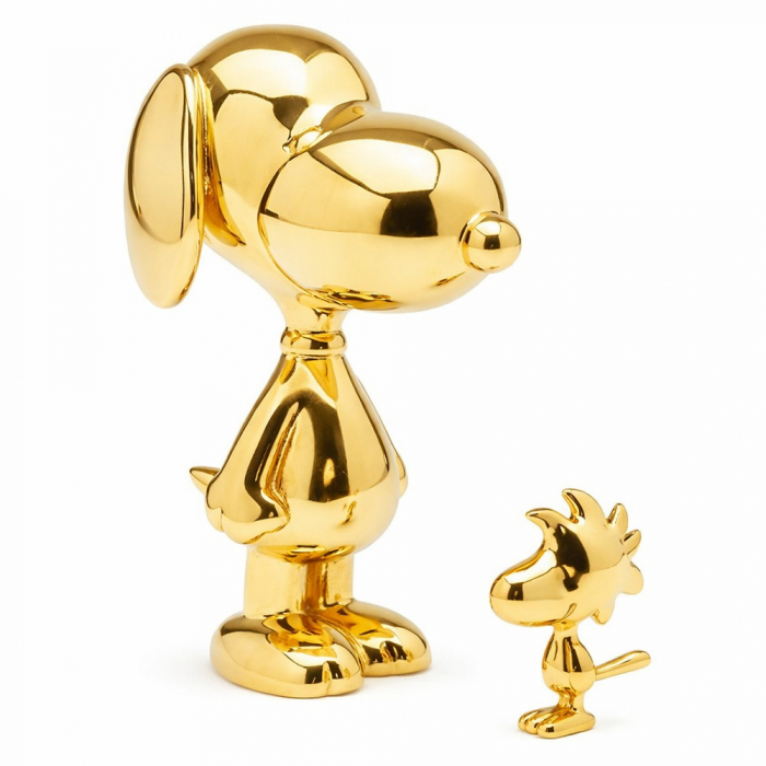 Figurine de collection par Skultuna tirée des aventures Peanuts: Snoopy avec Woodstock. Acier 316L de haute qualité plaqué or. Hauteur: 5,2cm.