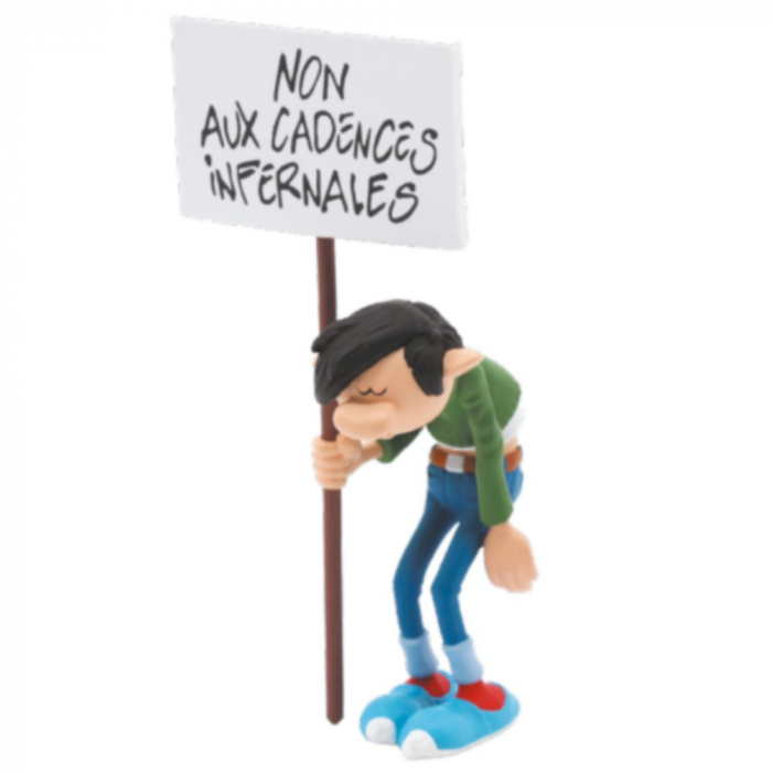Figurine de collection Plastoy en PVC: Gaston Lagaffe tenant une pancarte Non aux cadences infernales. Gaston a beau être paresseux, il sait se mobiliser pour les causes importantes !! Hauteur: 8,5cm.