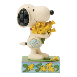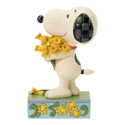 Figurine de Snoopy tenant un bouquet de fleurs. Chaque printemps, la floraison des jonquilles apporte de la joie à tout le monde !