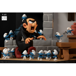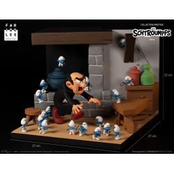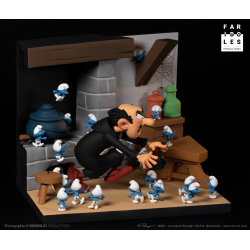 Saynète de collection Fariboles Gargamel, Les 21 Schtroumpfs et l'araignée: A moi les Schtroumpfs !! D'après l'univers des Schtroumpfs par Peyo. Edition limitée et numérotée à 350 exemplaires avec certificat d'authenticité. Livrée dans une boîte en bois. Dimensions de la scène: 27x27x22cm.