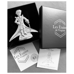 Figurine de collection Le Petit Prince en habit de prince Les étains de Virginie, livré dans une petite boîte écrin. Edition limitée et numérotée à 100 exemplaires avec certificat d'authenticité. Hauteur: 7cm.