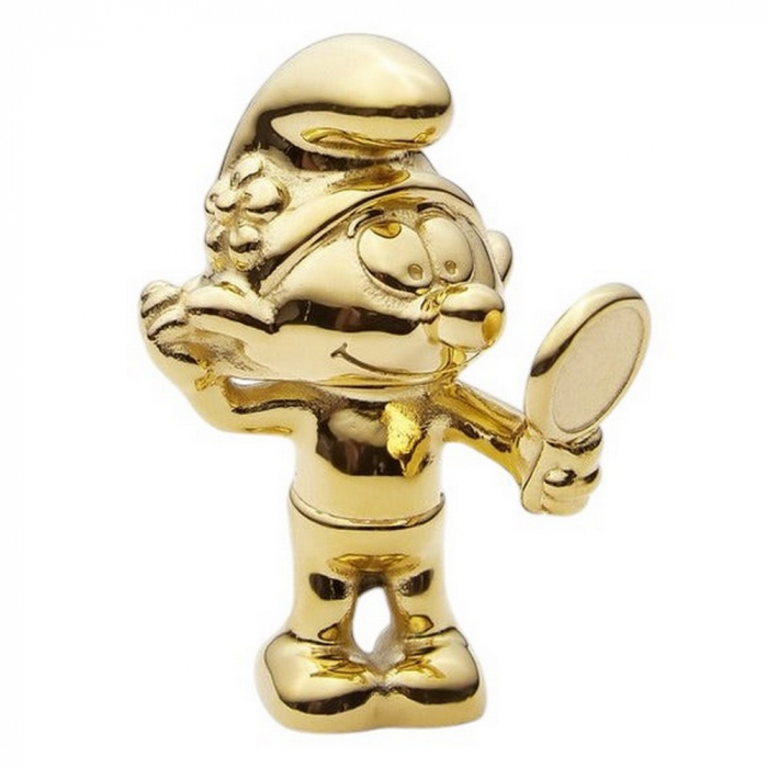 Figurine de collection par Skultuna tirée des aventures des Schtroumpfs: Le Schtroumpf coquet. Acier 316L de haute qualité plaqué or. Hauteur: 5,5cm.
