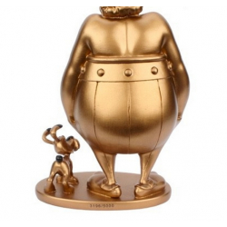 Figurine de collection Plastoy, Astérix: Obélix en train de bouder avec Idéfix. Statuette réalisée entièrement en résine et peinte à la main couleur dorée. Edition limitée et numérotée à 5000 exemplaires. Hauteur: 14,5cm.