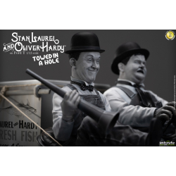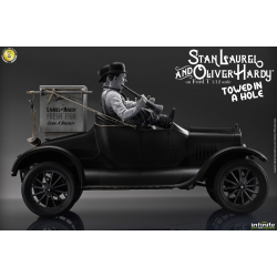 Nouvelle statue de collection à l'échelle 1/12 dédiée à Stan Laurel et Oliver Hardy, inspirée du court-métrage culte de 1932, Towed in a Hole. La scène met en scène le duo emblématique à bord de leur Ford T modifiée, utilisée pour la vente de poisson au porte-à-porte, entouré de caisses, d'outils et d'accessoires finement sculptés.