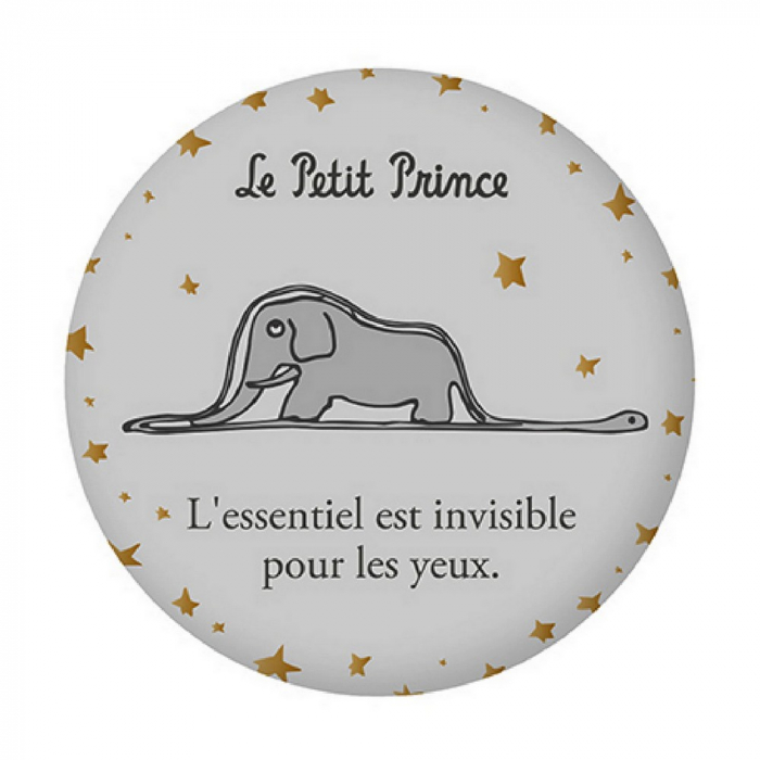 Magnet rond décoratif Le Petit Prince: éléphant et serpent version 2, avec la phrase: L'essentiel est invisible pour les yeux. 55mm.