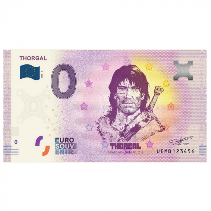 Ce billet commémoratif de 0€ est un billet de banque en tirage limité. Il s'agit d'un billet de Thorgal de la collection de billet Euro Souvenir à l'éffigie des héros de la bande déssinée européenne. Edition limitée et numérotée à 5000 exemplaires.