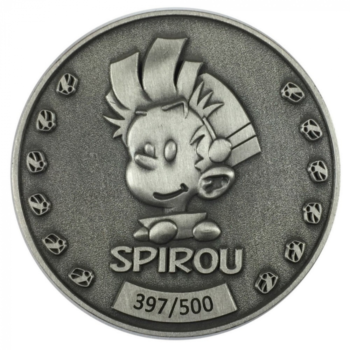Médaille de Spirou et Fantasio avec le Marsupilami éditée par Bandeciné en hommage aux personnages de Franquin. Médaille de 50mm fabriquée en Zamac. Edition limitée et numérotée à 500 exemplaires.