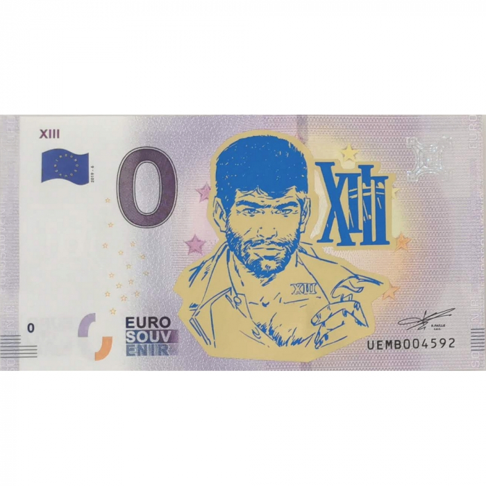 Ce billet commémoratif de 0€ est un billet de banque en tirage limité. Il s'agit d'un billet de XIII de la collection de billet Euro Souvenir à l'éffigie des héros de la bande déssinée européenne. Edition spéciale Or au sein de l'édition limitée et numérotée à 5000 exemplaires.