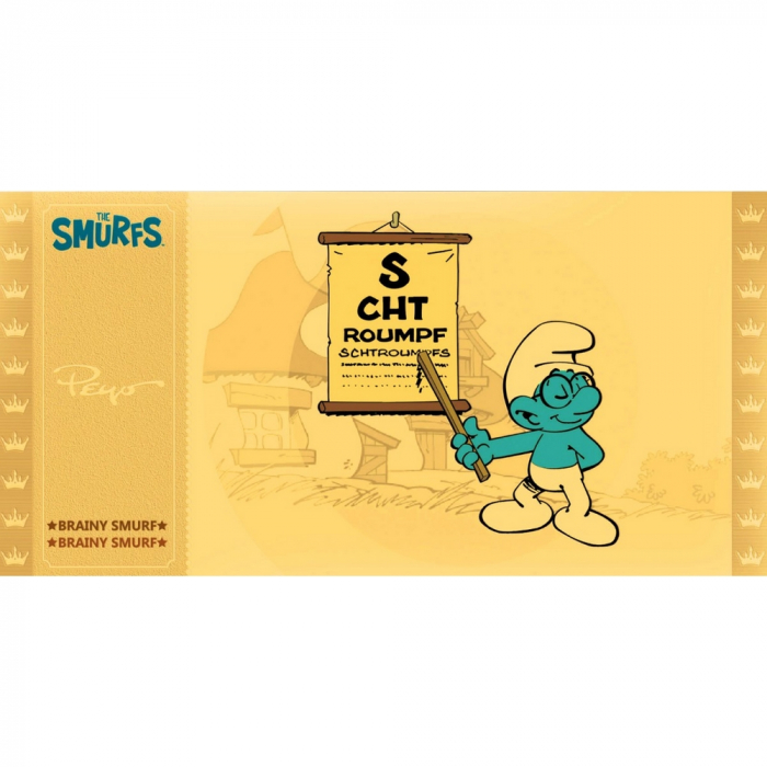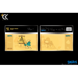 Billet de collection CK Les Schtroumpfs: Schtroumpf à lunettes. Produit officiel, édition limitée par Cartoon Kingdom. Chaque ticket est soigneusement imprimé en Haute Définition sur du papier PVC indéchirable, lavable et recouvert d'une fine couche de dorure très brillante. Dimensions : 14,5x7,5cm.