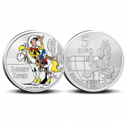 Une édition exceptionnelle en l'honneur de Lucky Luke. Pièce de 5 € éditée par la Monnaie Royale de Belgique. Edition limitée à 7500 unités. Cours légal en Belgique, pas de mise en circulation. Couleur BU.