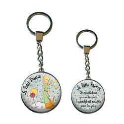 Porte-clés rond en verre et métal de collection Le Petit Prince: Rose et Renard. Diamètre: 4cm.