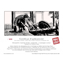 Cette affiche offset d'art dérivée de la bande dessinée Corto Maltese de Hugo Pratt est imprimée sur un papier d'art épais satiné. 70x70cm. Lointain.