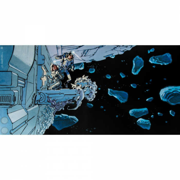 Cette affiche offset d'art dérivée de la bande dessinée Valérian et Laureline de Jean-Claude Mézières est imprimée sur un papier d'art Fedrigoni Stucco Old Mill 250g. 50x25cm. L'espace. Edition limitée à 700 exemplaires.