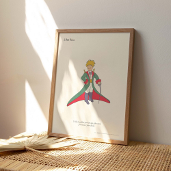 Impression officielle en édition d'art imprimée sur papier vergé crème 220g. Cadre non fourni. Chaque affiche comporte en bas à droite un tampon à sec attestant de son authenticité. Imprimé en France. Reproduction d'une illustration de l'oeuvre d'Antoine de Saint-Exupéry: Le Petit Prince en habit de prince.