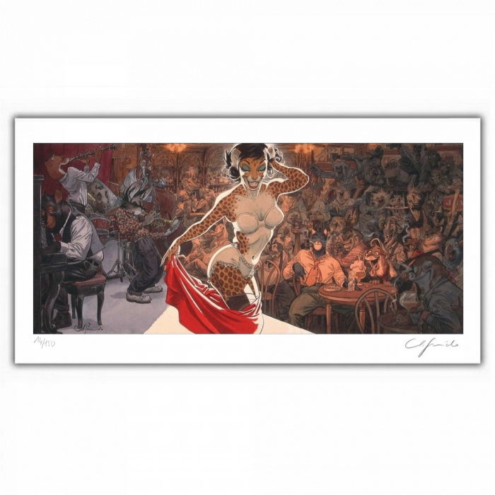 Cette estampe pigmentaire d'art dérivée de la bande dessinée Blacksad de Juanjo Guarnido est imprimée sur un papier d'art Innova 210g. Edition limitée et numérotée à 150 exemplaires signée à la main par Juanjo Guarnido. 60x30cm. Jazz n' Fun's Club