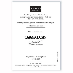Cette affiche offset d'art dérivée de la bande dessinée de Gaston Lagaffe par Franquin est imprimée sur un papier d'art Conquéror Connoisseur 100% coton / 315g. Chaque exemplaire est encadré dans une Marie-Louise noire ornée d’une plaque en étain Akimoff. Edition limitée et numérotée à 99 exemplaires. Dimensions: 30x40cm. Le tandem electrique.