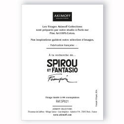 Affiche offset d'art dérivée de la bande dessinée Spirou & Fantasio par Franquin au Journal Spirou Couverture de l'album du journal n°75 - 1960 est imprimée sur un papier d'art Conquéror Connoisseur 100% coton/315g. Chaque exemplaire est encadré dans une Marie-Louise noire ornée d’une plaque en étain Akimoff. Edition limitée et numérotée à 99 exemplaires. Dimensions: 30x40cm. Avec Zorglub.