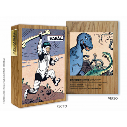 2 faces illustrées par des scènes mythiques de l’album Le Piège Diabolique d'Edgar P. Jacobs. Mortimer se saisit d'un os en forme de massue, ajuste son casque, et faisant tournoyer cette arme improvisée, charge intrépidement les monstrueux oiseaux !