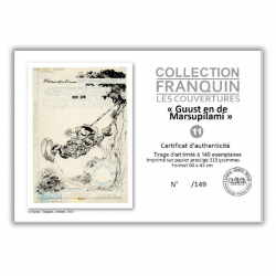 Cette estampe d'art dérivée de la bande dessinée Gaston Lagaffe, Franquin est imprimée par encres pigmentaires, résistent à l’eau et aux UV, sur papier Fine Art paper 315gr/m2, 100% coton marque Innova ref IFA22. Edition limitée à 149 exemplaires avec certificat d'authenticité. Étude de couverture: Gaston Lagaffe, Guust en de Marsupilami. Dimensions: 43x60cm.