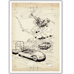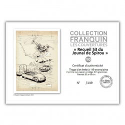 Cette estampe d'art dérivée de la bande dessinéeFranquin Spirou et Fantasio est imprimée par encres pigmentaires, résistent à l’eau et aux UV, sur papier Fine Art paper 315gr/m2, 100% coton marque Innova ref IFA22. Edition limitée à 149 exemplaires avec certificat d'authenticité. Étude de couverture: Spirou et Fantasio, Recueil 53 Journal Spirou. Dimensions: 44x60cm.