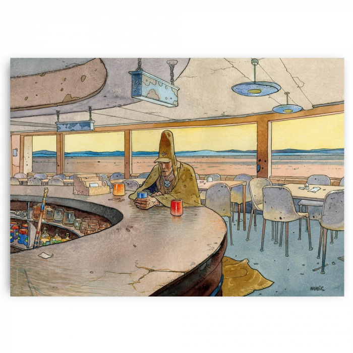 Produit officiel sous licence en édition d'art imprimée sur papier Novatech demi-mat 250g. Cadre non fourni. Moebius Arzak - Barvide. Jean Giraud. Dimensions: 70x50cm.