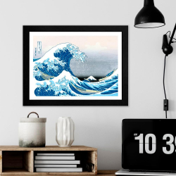 Affiche Encadré offset Art Print Hokusai, Grande de Vague Kanagawa. Une impression d'art (plaque) est une reproduction imprimée d'une œuvre d'art originale. Un Art Print est imprimé sous une finition brillante et une qualité de papier bien supérieure à celle d'un poster avec un cadre noir brillant. Dimensions: 40x30cm.