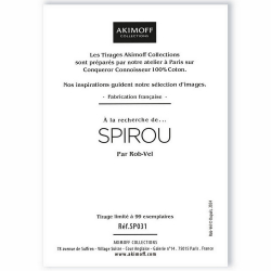Affiche offset d'art dérivée de la BD Spirou & Fantasio créé en 1938 par Robert Velter, alias Rob-Vel, à la demande de l’éditeur Jean Dupuis. Imprimée sur un papier d'art Conquéror Connoisseur 100% coton/315g. Chaque exemplaire est encadré dans une Marie-Louise noire ornée d’une plaque en étain Akimoff. Edition limitée et numérotée à 99 exemplaires. Dimensions: 30x40cm. S de Spirou.