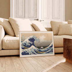 Impression officielle en édition d'art imprimée sur papier vergé crème 220g. Cadre non fourni. Chaque affiche comporte en bas à droite un tampon à sec attestant de son authenticité. Imprimé en France. Reproduction d'une illustration de l'oeuvre de Katsushika Hokusai, la Grande Vague de Kanagawa.