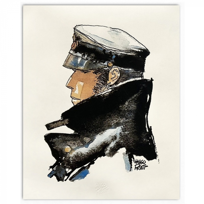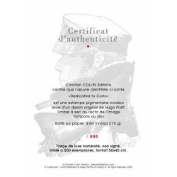 Cette affiche offset d'art dérivée de la bande dessinée Corto Maltese de Hugo Pratt est imprimée sur un papier d'art de qualité estampe pigmentaire. Edition limitée à 500 exemplaires avec certificat d'authenticité numéroté. 40x50cm. Dedicated to Corto.