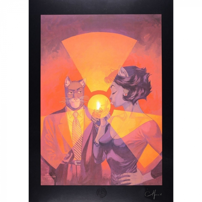 Cette affiche offset d'art dérivée de la bande dessinée Blacksad de Juanjo Guarnido est imprimée sur un papier d'art Fedrigoni Stucco Old Mill 250g. 50x70cm. Âme Rouge. Signée à la main par Juanjo Guarnido.