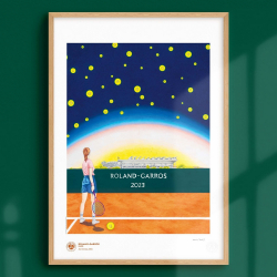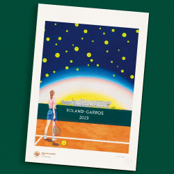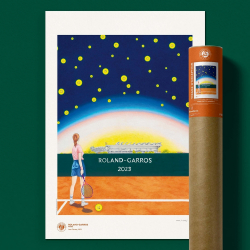 Pour Roland-Garros 2023, Maxime Verdier signe une affiche poétique et radieuse, entièrement réalisée au crayon de couleur. Sous un ciel étoilé de balles jaunes, une jeune fille raquette à la main contemple l’horizon, tandis que le court Philippe-Chatrier baigné de lumière invite chacun à rêver et à imaginer tous les possibles.