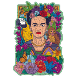 Puzzle Ravensburger de 300 pièces en bois, Frida Kahlo. Découvrez une nouvelle façon de composer des puzzles grâce aux pièces en bois naturel robustes et de haute qualité. 25 petites figurines en bois (whimsies) se cachent parmi les 300 pièces du puzzle. Découpées au laser avec précision, ces figurines sont en lien direct avec le thème de l'image. 27x39cm.