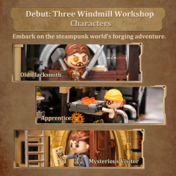 Mais le vrai plaisir se cache à l’intérieur. Le moulin révèle plusieurs salles de travail : une forge avec ses braises incandescentes, une table de conception remplie de plans secrets, des machines-outils et même un bras articulé prêt à fabriquer l’impossible. Tout respire le bricolage de génie et la passion du détail. Les trois figurines incluses, au look de bricoleurs excentriques, ajoutent une touche narrative irrésistible.