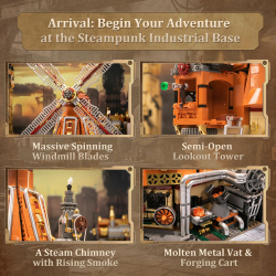 Dès les premiers assemblages, les engrenages entrent en scène. On monte les murs obliques, on fixe les grandes pales et on trace peu à peu le profil de ce moulin hors normes. Des tuyaux serpentent le long de la structure, une cheminée industrielle crache une vapeur fictive, et des rouages d’époque s’imbriquent à la perfection dans un décor à la fois brut et raffiné.