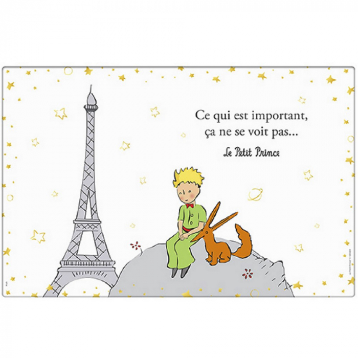 Set de table en plastique Kiub Le Petit Prince assis sur sa planète Renard et Tour Eiffel. Dimensions: 43x28cm.