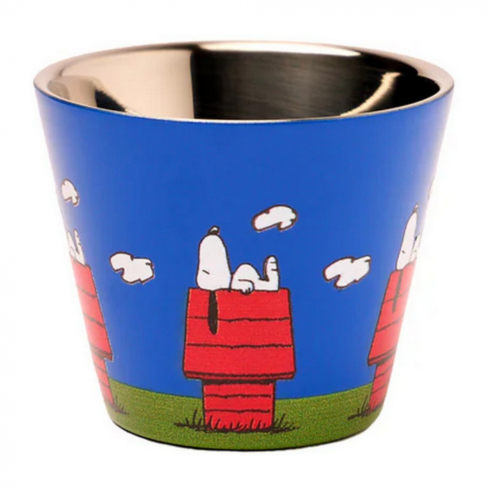 Tasse à café Expresso isotherme Peanuts, Snoopy: Niche. Fabriqué en acier inoxydable 304 à double paroi. Sans BPA. Ne convient pas aux lave-vaisselle ni aux micro-ondes. 90ml.
