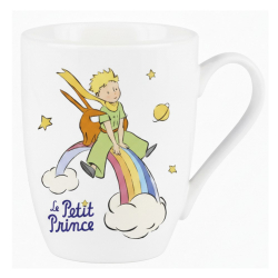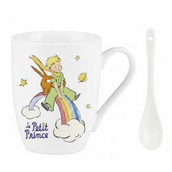 Tasse mug et cuillère en porcelaine de la marque Enesco de qualité Le Petit Prince: assis sur un arc-en-ciel. D'après les dessins originaux d'Antoine de Saint-Exupery. Produit sous licence officielle du Petit Prince. Hauteur: 10,5cm.